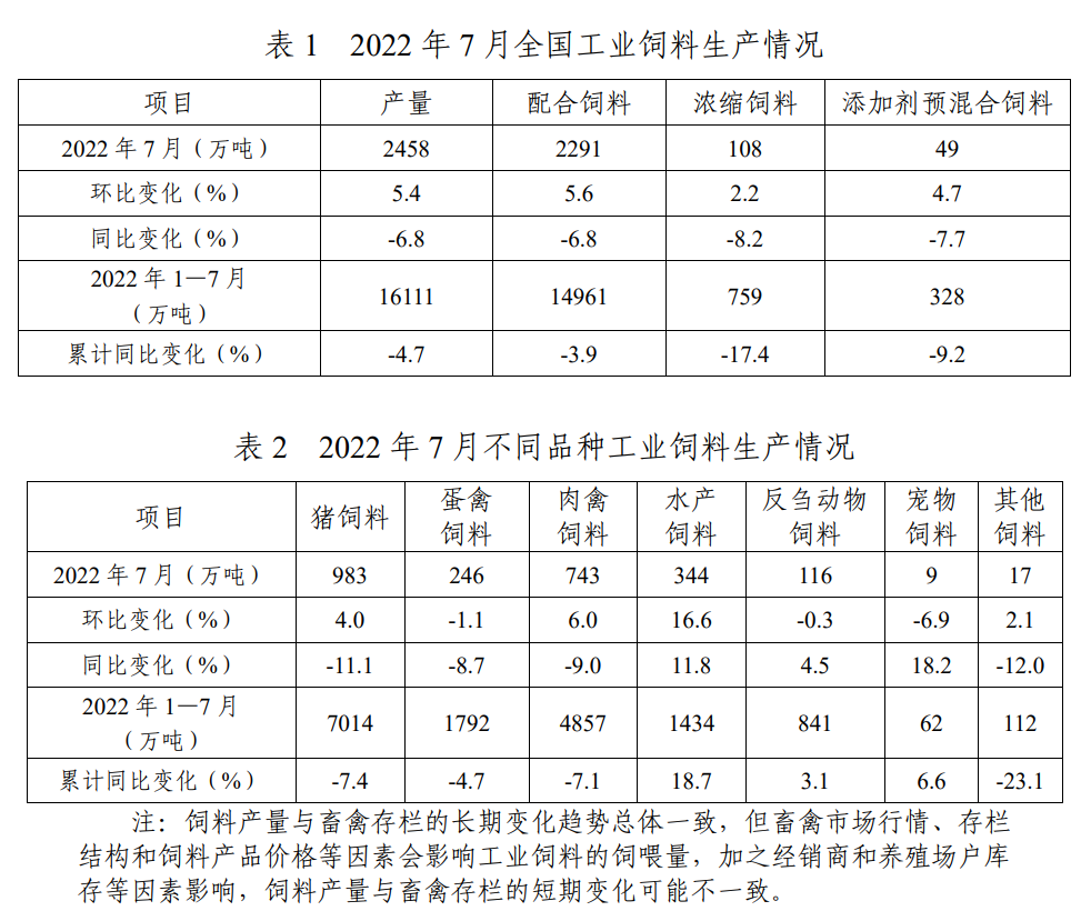 2022年1—7月,全国工业饲料总产量16111万吨,同比下降4.7%。其中,猪、蛋禽、肉禽饲料产量分别为7014万吨、1792万吨、4857万吨,同比分别下降7.4%、4.7%、7.1%;水产、反刍动物饲料产量分别为1434万吨、841万吨,同比分别增长18.7%、3.1%。