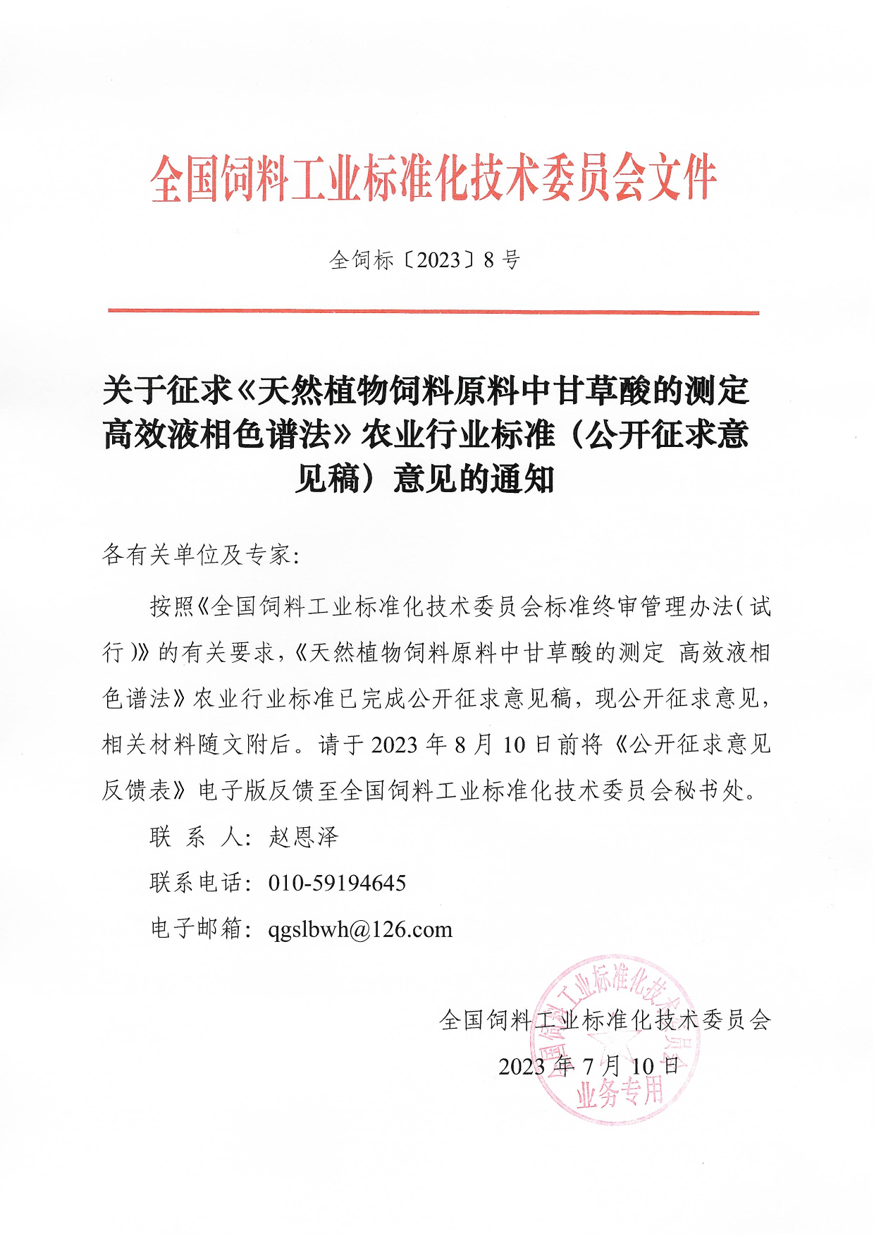 关于征求《天然植物饲料原料中甘草酸的测定 高效液相色谱法》农业行业标准(公开征求意见稿)意见的通知