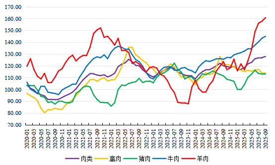 2025年9月份,FAO肉类价格指数小幅上涨,猪肉、牛肉、羊肉、禽肉价格均上涨。FAO肉类价格指数(基期为2014—2016年)2024年1月份降至108.86后反弹,2025年9月份为127.82,环比涨0.7%,同比涨6.6%。