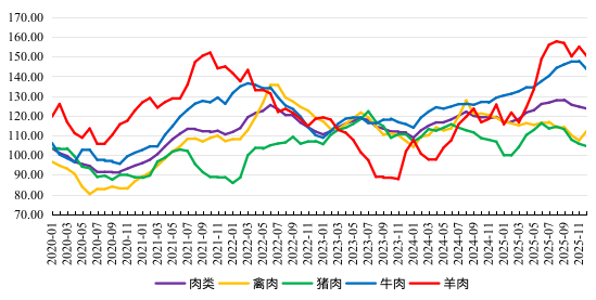 2025年12月份,FAO肉类价格指数小幅下降,其中,禽肉价格上涨,猪肉、羊肉、牛肉价格下降。FAO肉类价格指数(基期为2014—2016年)2024年1月份降至108.86后反弹,2025年12月份为123.64,环比跌0.8%,同比涨3.6%。