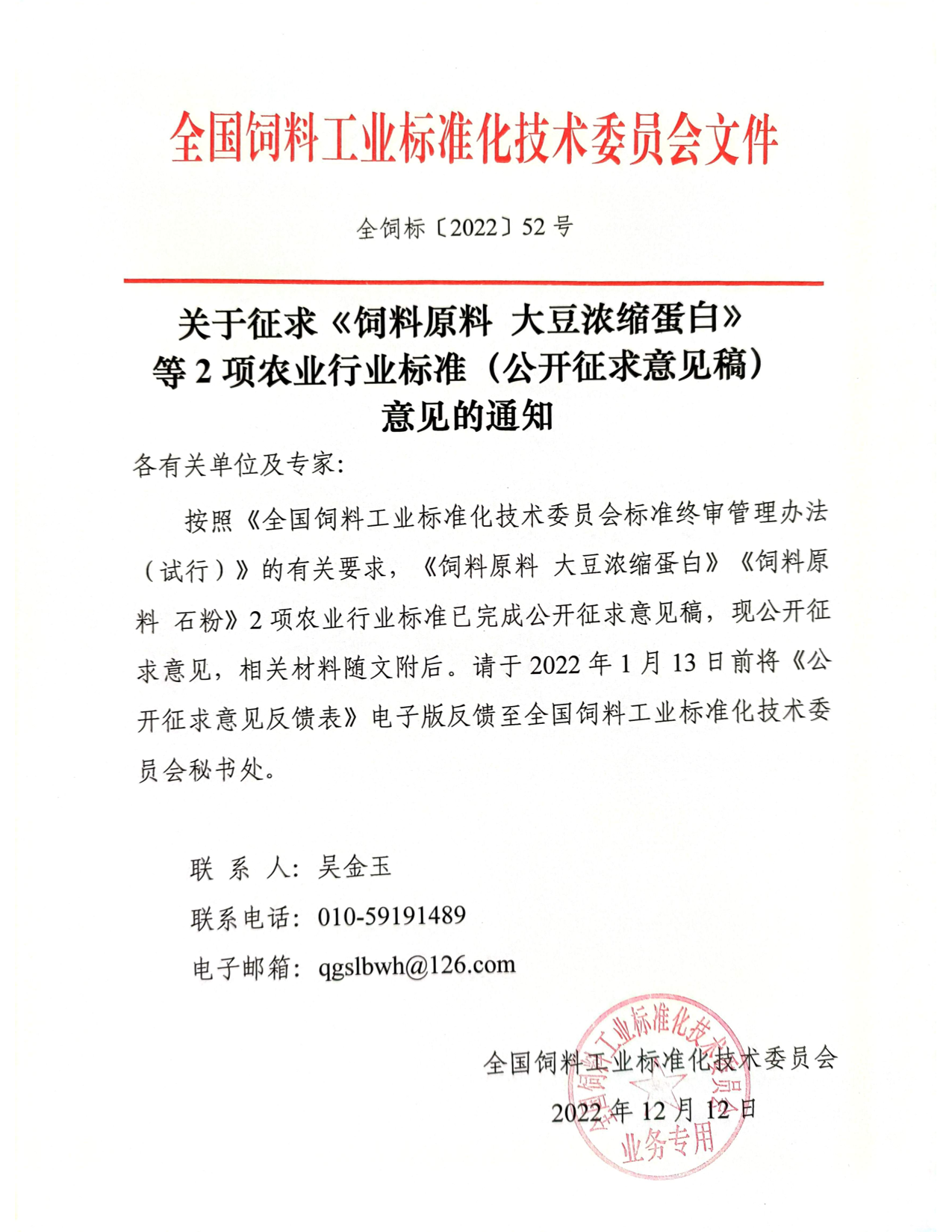关于征求《饲料原料 大豆浓缩蛋白》等2项农业行业标准(公开征求意见稿)意见的通知