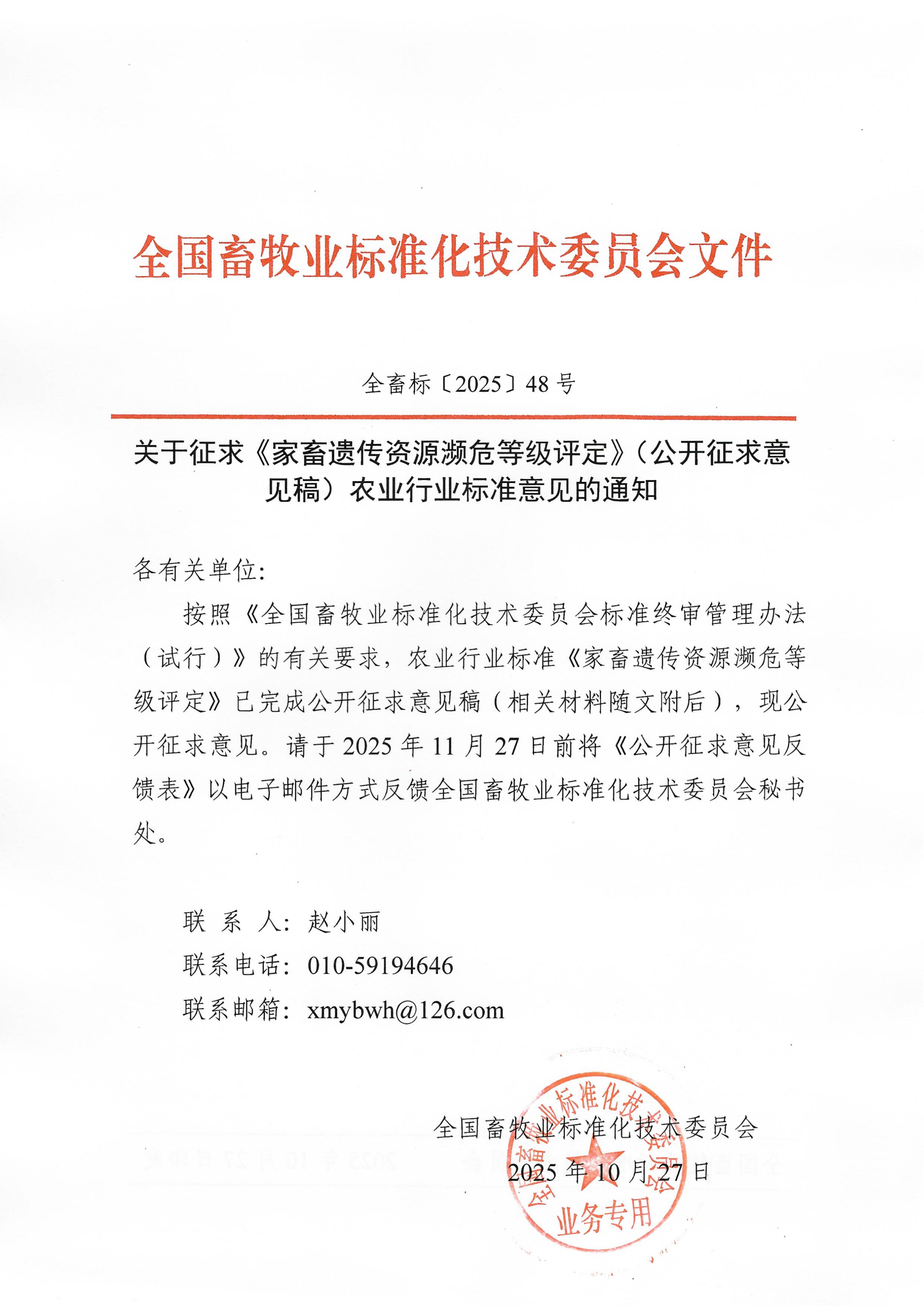 关于征求《家畜遗传资源濒危等级评定》(公开征求意见稿)农业行业标准意见的通知