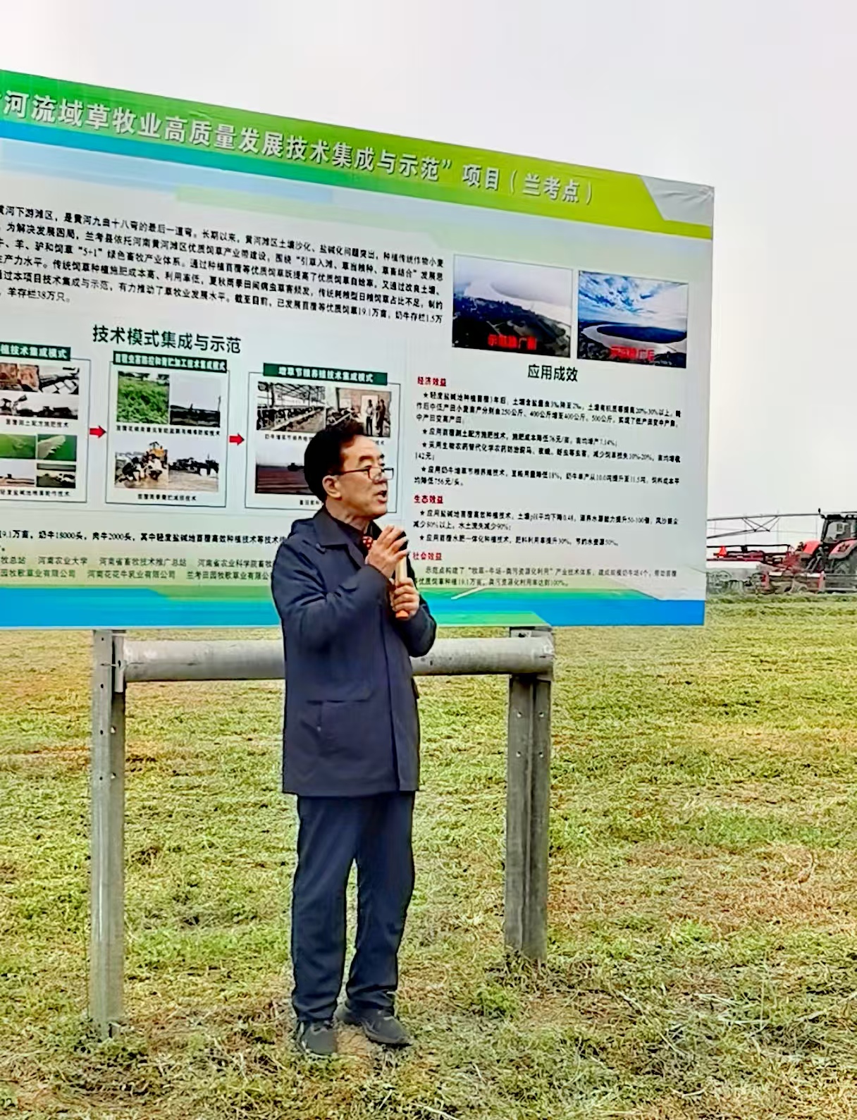 主讲人是河南农业大学王成章教授,他负责的黄河流域草牧业高质量发展技术集成与示范项目(兰考点)就扎根于此。置身于十万亩苜蓿基地的绿色海洋中,他的声音充满自豪,大家脚下这片地,三年前种小麦,亩产只有250公斤,是典型的低产田。通过秋播避盐、加大播量、测土配方施肥三重技术,苜蓿不仅能在盐碱地茁壮成长,更能改良土壤。“种了三年苜蓿后,土壤盐分从0.3%降到0.2%,再种小麦亩产能蹿到400多公斤,低产田变成了中产田。”