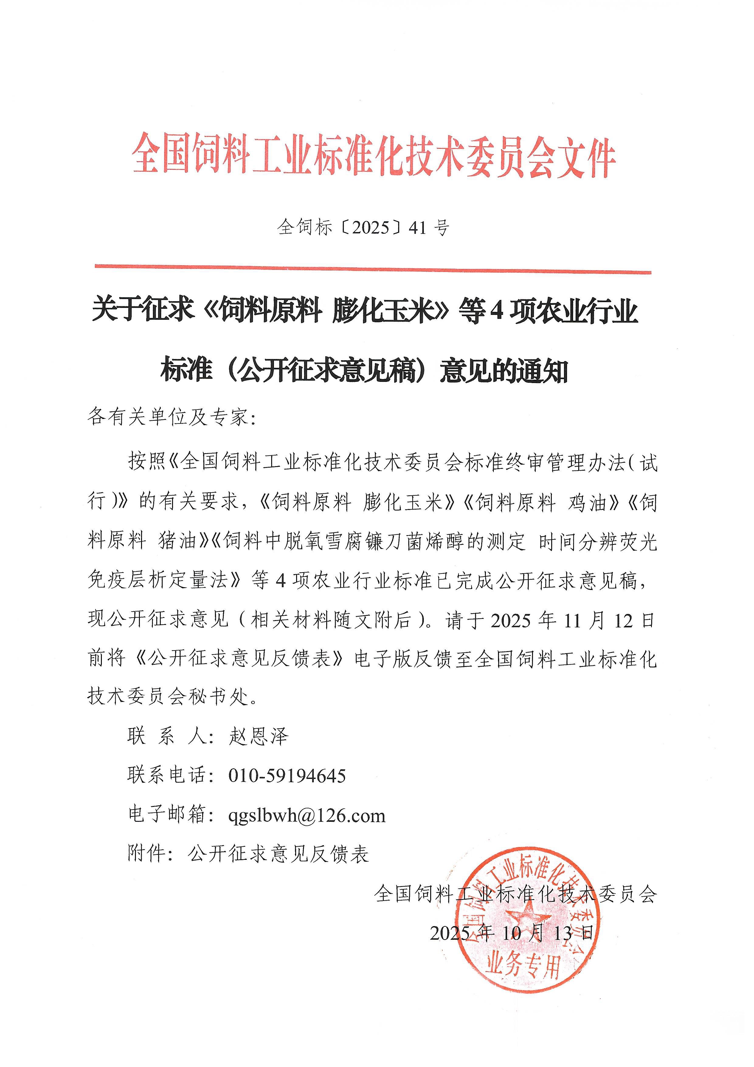 关于征求《饲料原料 膨化玉米》等4项农业行业标准(公开征求意见稿)意见的通知