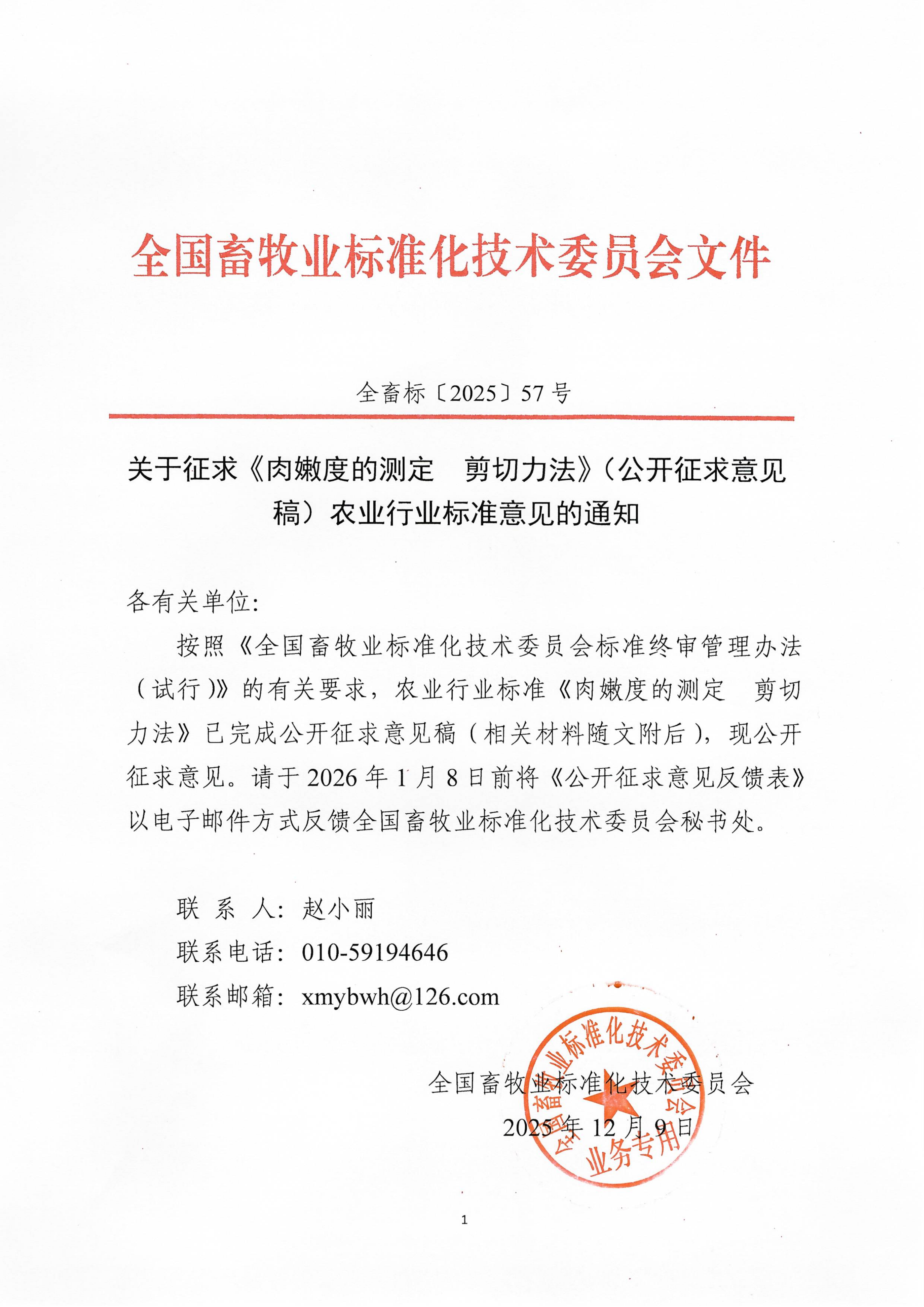 关于征求《肉嫩度的测定 剪切力法》(公开征求意见稿)农业行业标准意见的通知