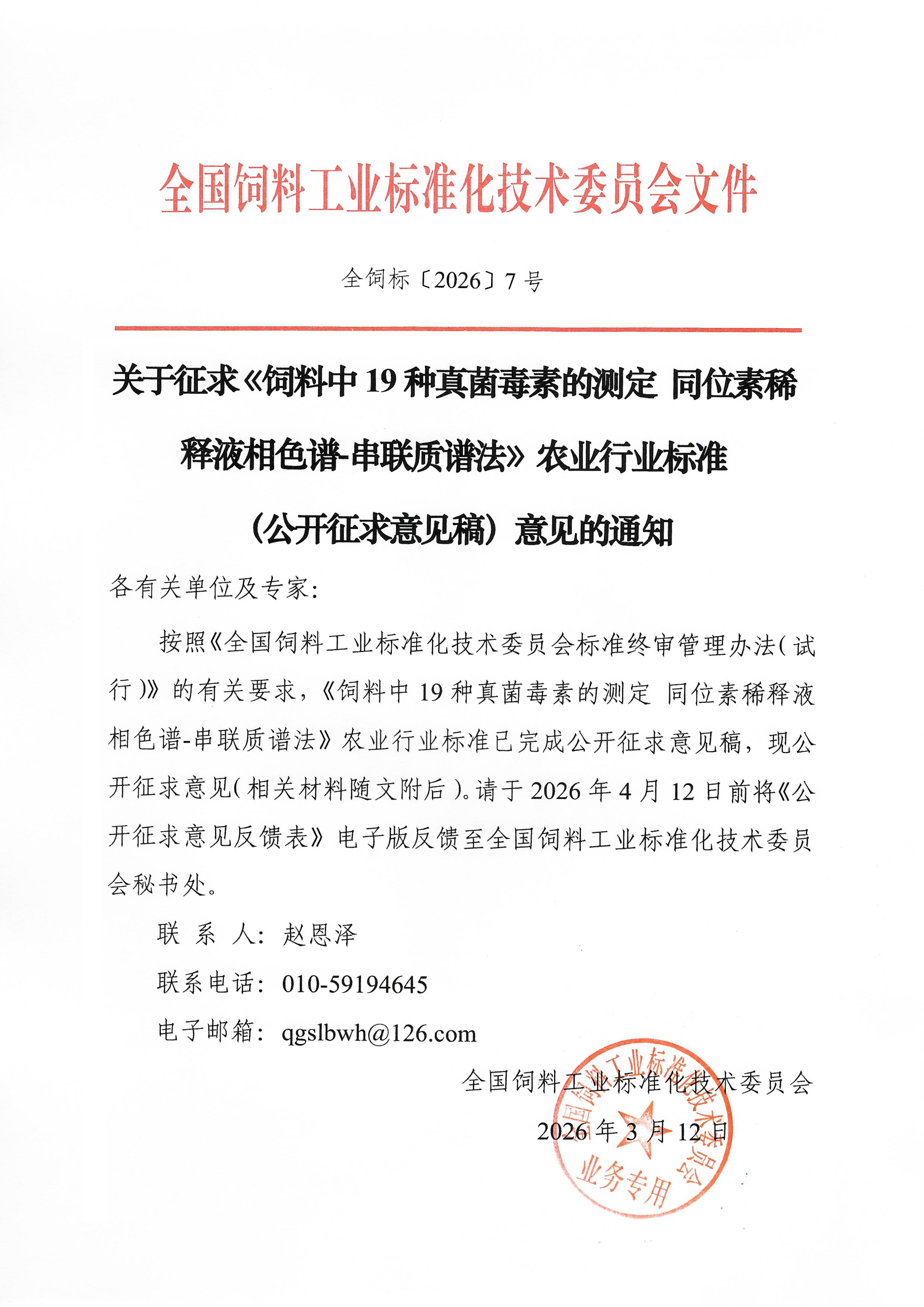 关于征求《饲料中19种真菌毒素的测定同位素稀释液相色谱串联质谱法》农业行业标准(公开征求意见稿)意见的通知