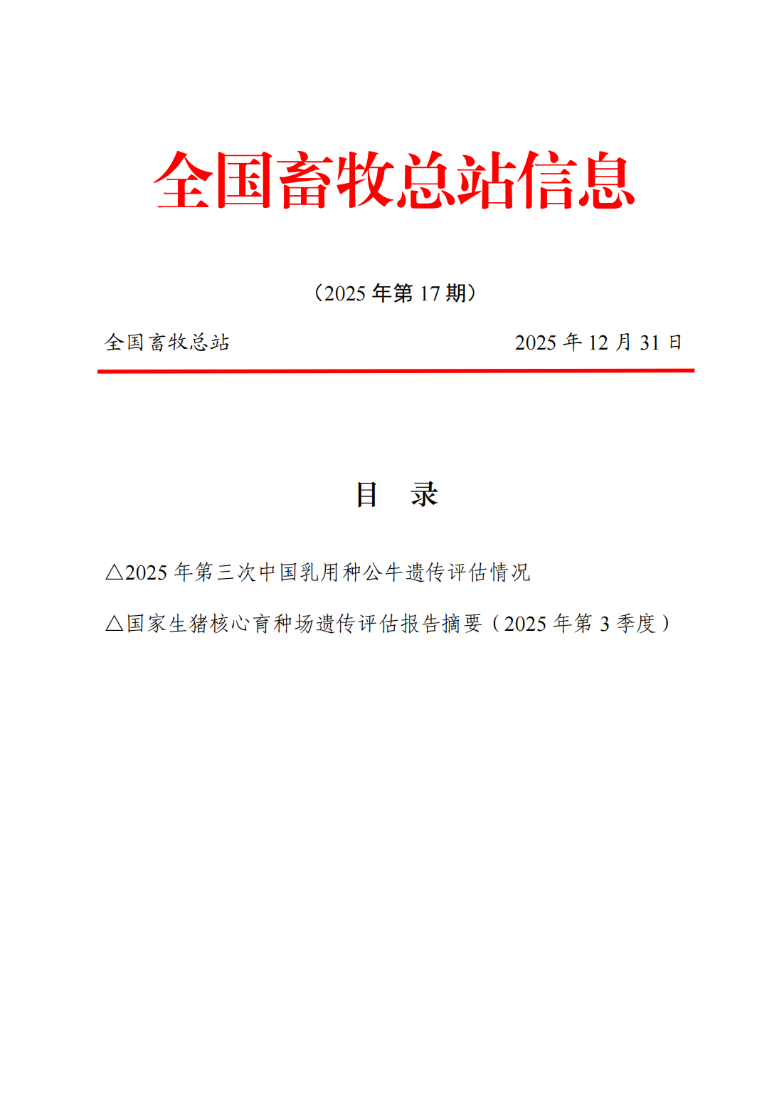 全国畜牧总站信息2025年第17期-2025年第三次中国乳用种公牛遗传评估情况、国家生猪核心育种场遗传评估报告摘要(2025年第3季度)